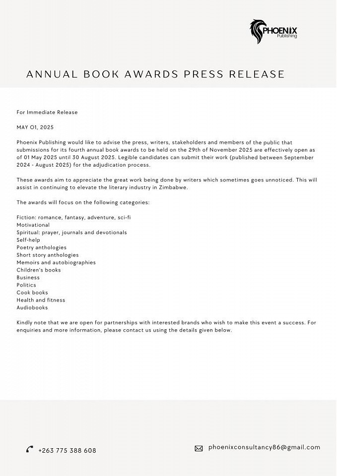 The countdown is on! Submissions for the Fourth Annual Phoenix Publishing Book Awards close on 30 August 2025 — and this is your chance to be part of Zimbabwe’s most celebrated literary stage.